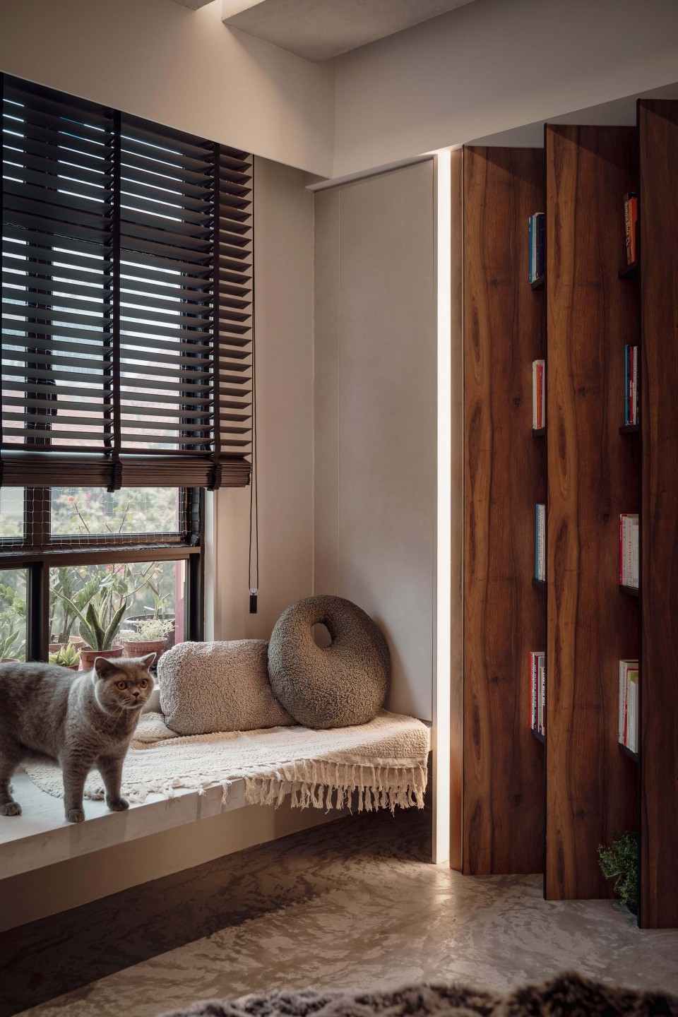 The bedrooms and bathrooms on the other side of the wall — the “back of house”, if you will — have been reconfigured so they can be neatly concealed, leaving a narrow corridor that doubles as a private play route for the cats.