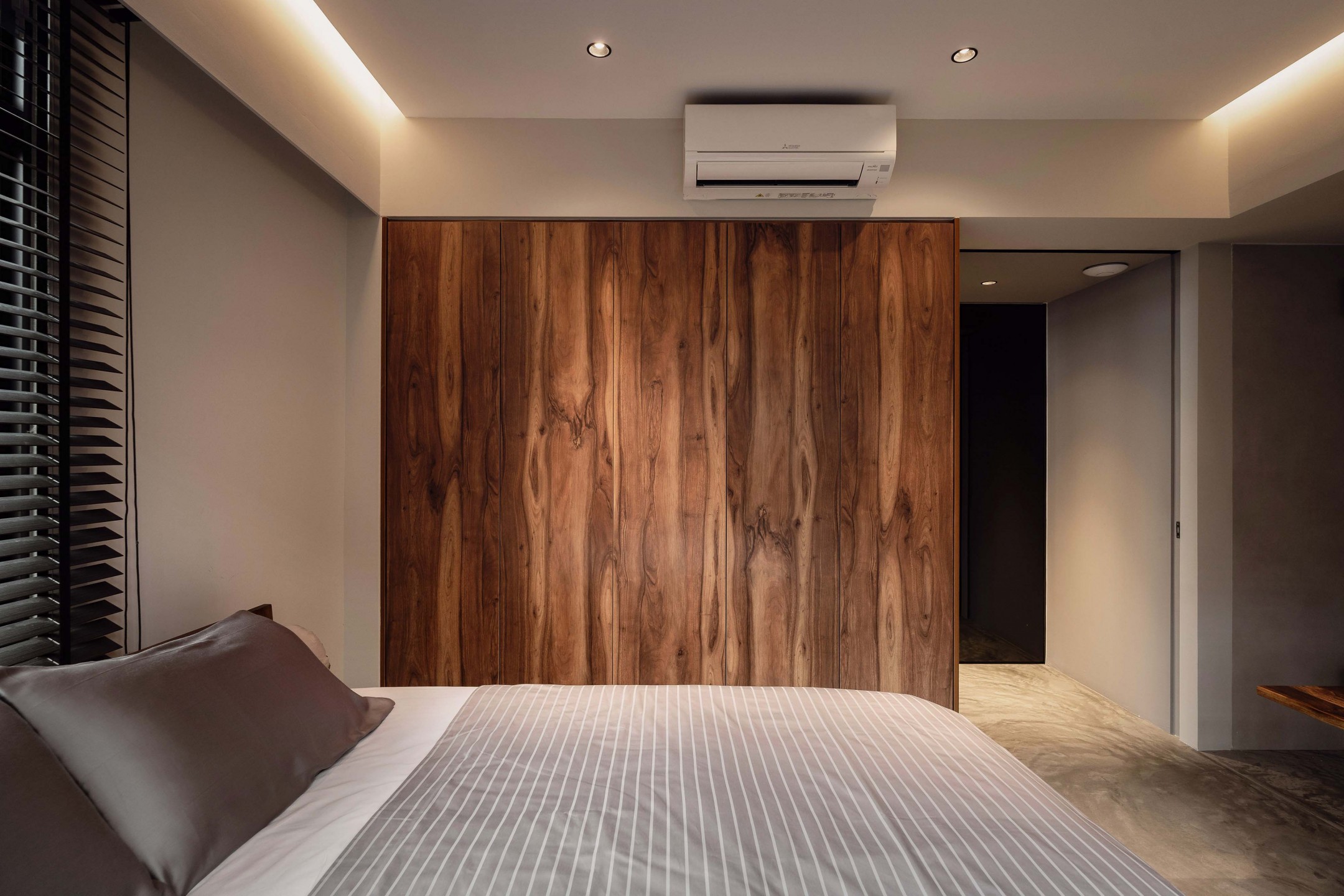 These changes also improve the apartment’s functionality. Concealing the common bathroom from the living area creates a greater sense of privacy, while the master bedroom makes room for more wardrobe space. The bathroom entrance has also been shifted away from the sleeping area, so one partner can get up earlier without disturbing the other.