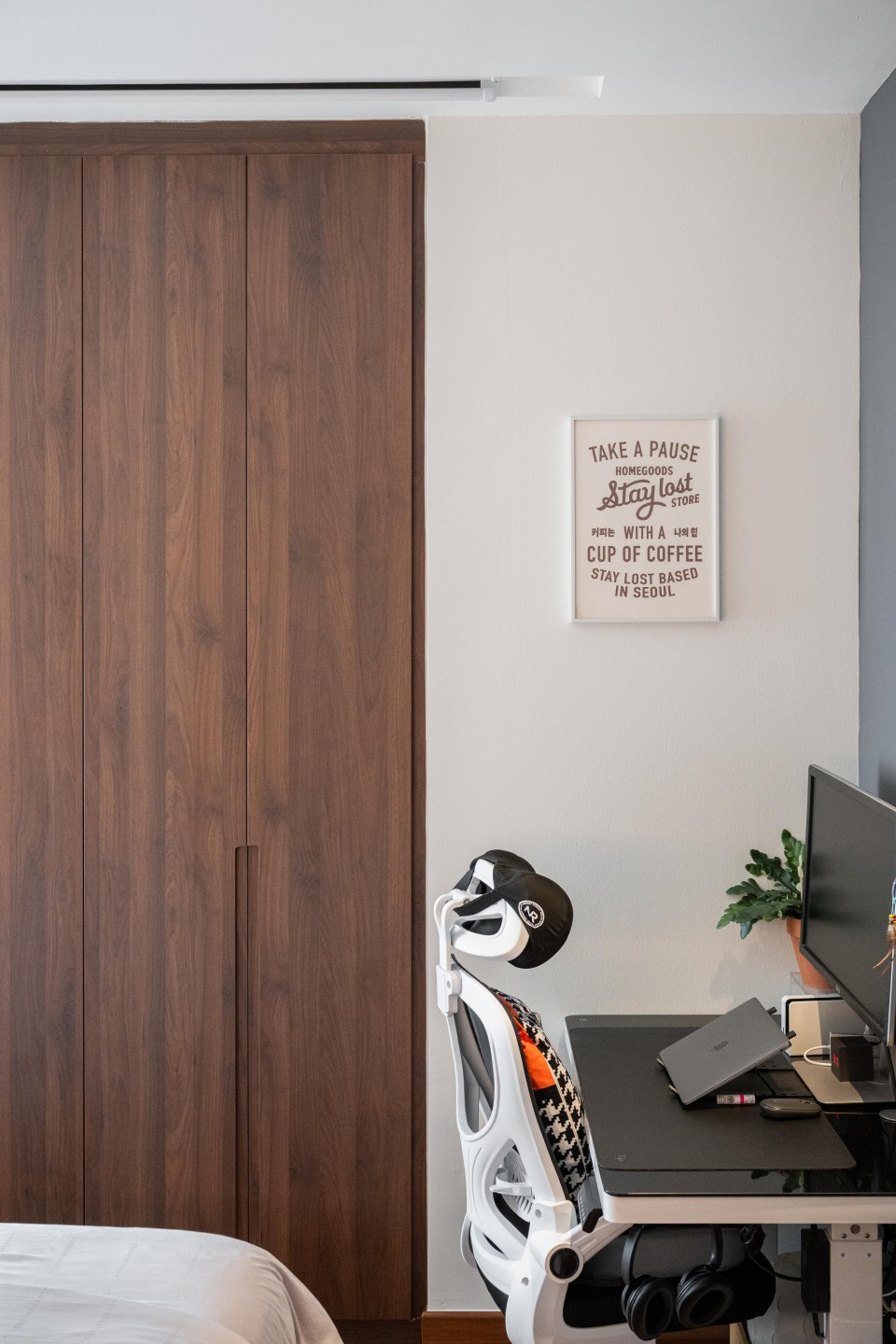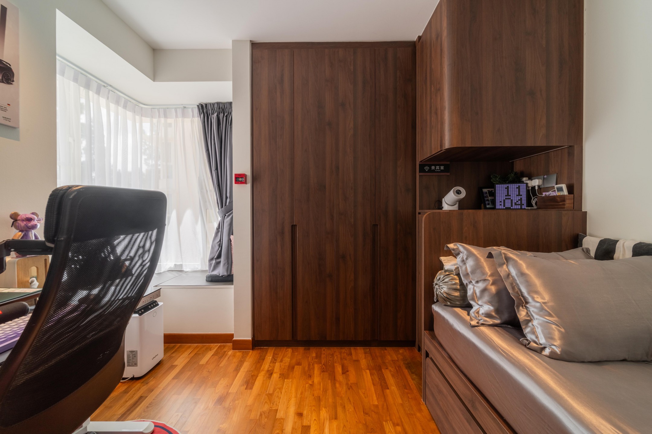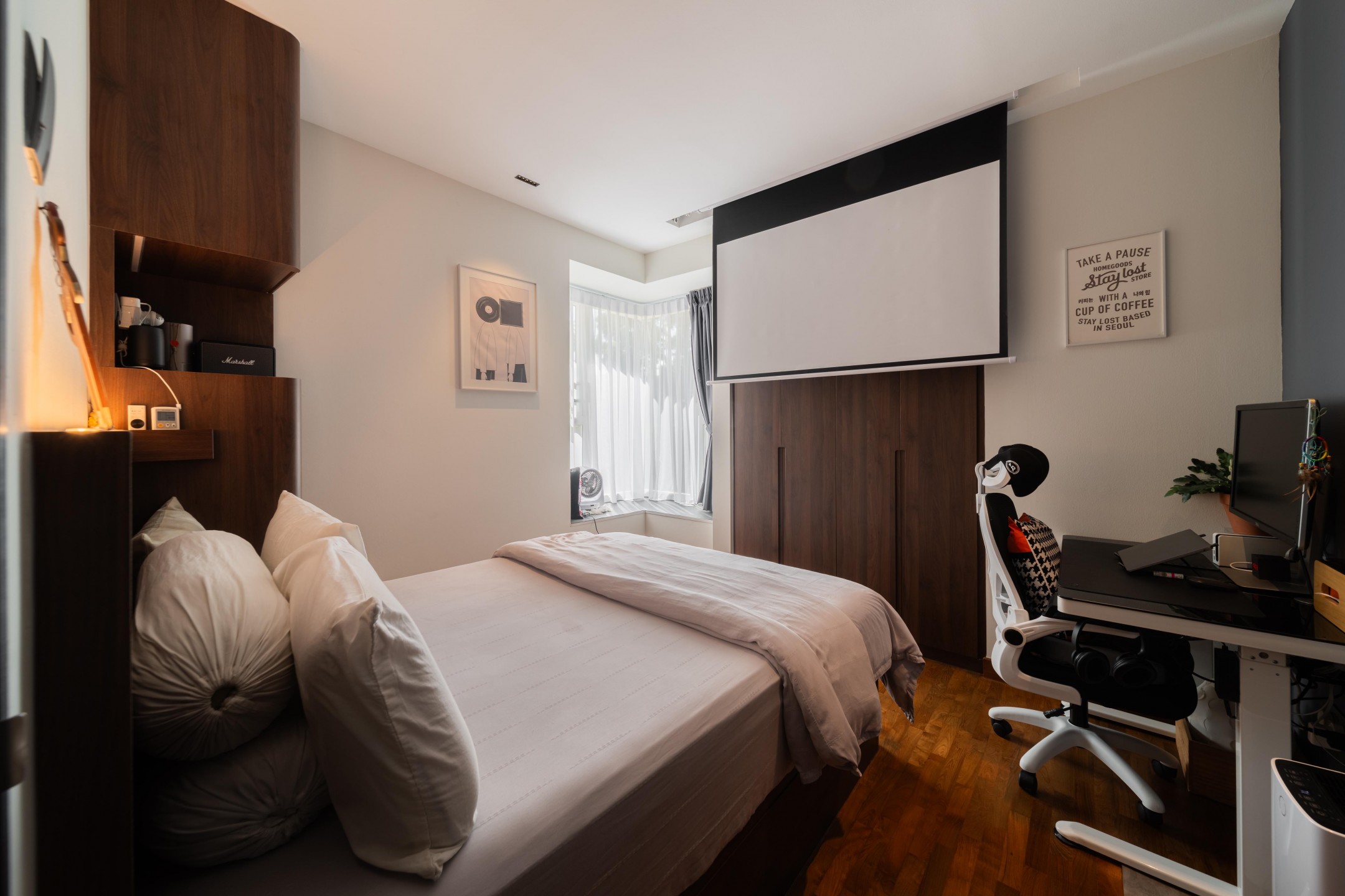 In one common bedroom, a concealed projector replaces a conventional television setup, freeing up valuable wall space for storage. It also reflects the older son’s interests as an audiophile, with a growing collection of audio equipment neatly displayed.
