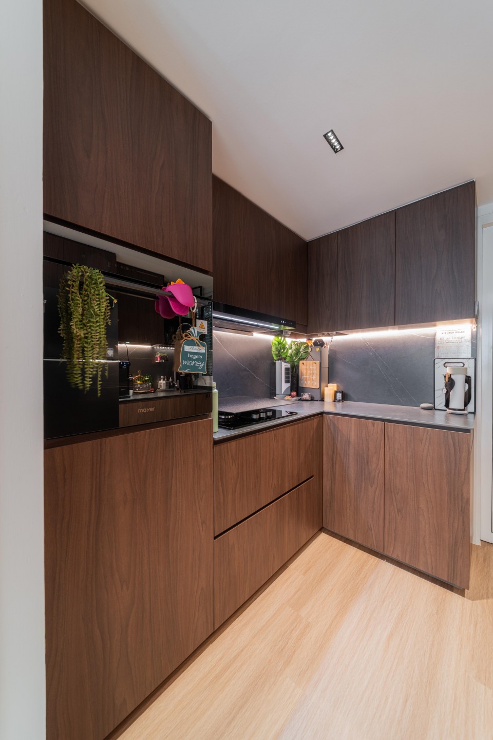 Although the kitchen footprint is relatively compact, the homeowners cook regularly, so storage planning became especially important. Overhead cabinets maximise usable space while keeping appliances neatly integrated.