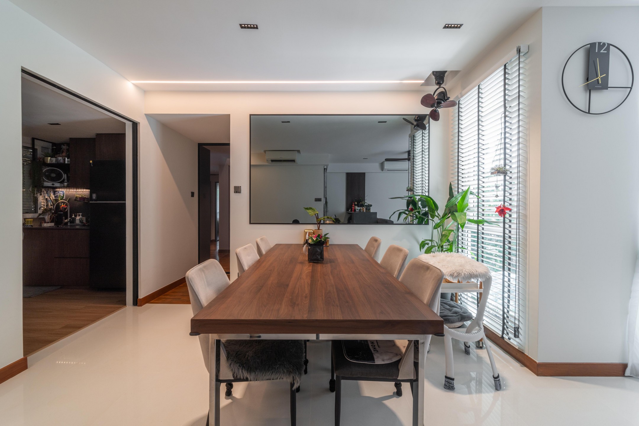 A tinted mirror panel along the dining wall further enhances the sense of openness by reflecting natural light around the shared zones.