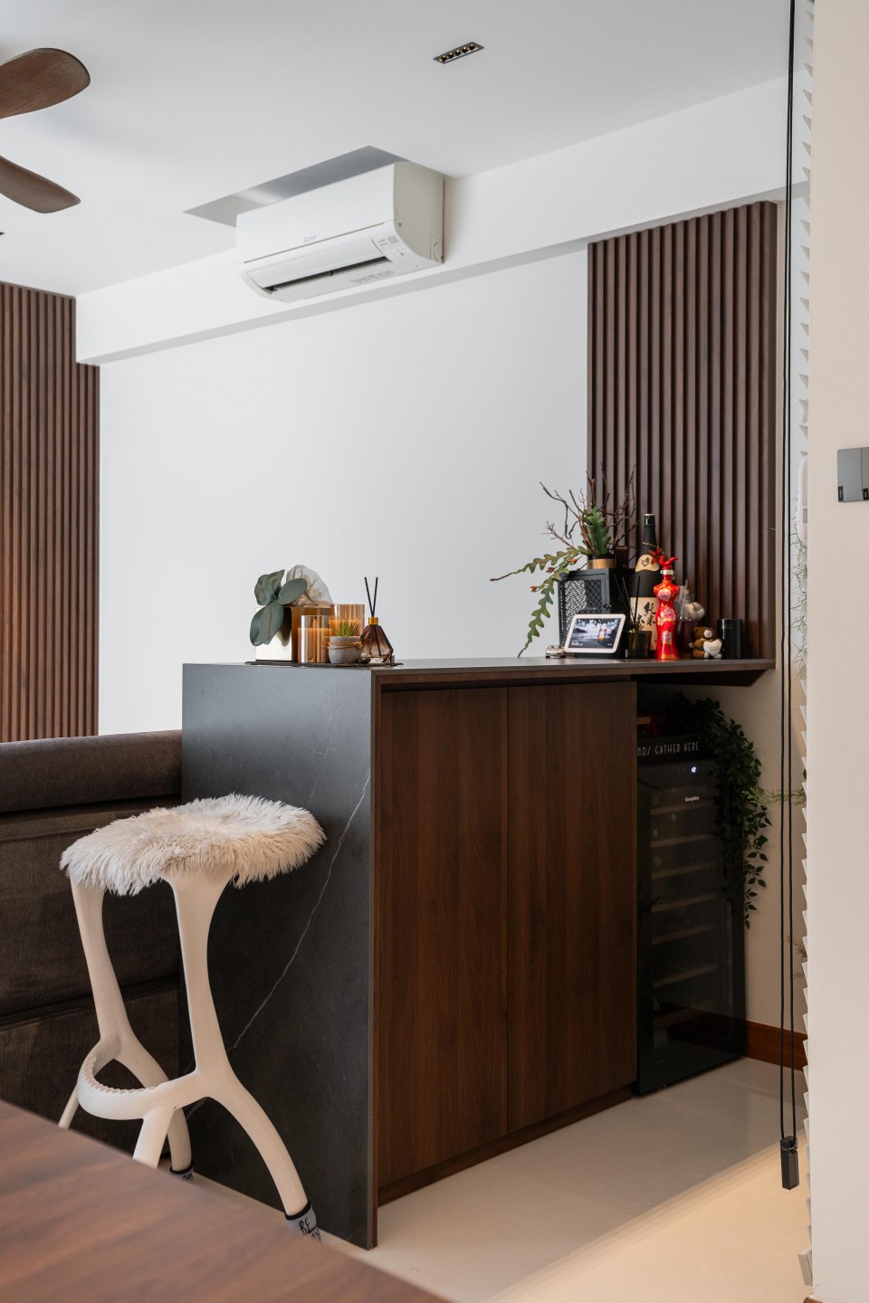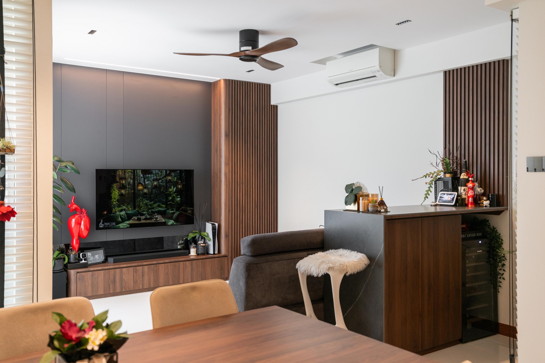 In the living area, wood-look fluted laminate panels frame the TV feature wall as a key design highlight, and continue beside the island counter to visually connect the different zones. A mirror insert at the base of the TV feature wall bounces light gently across the space.