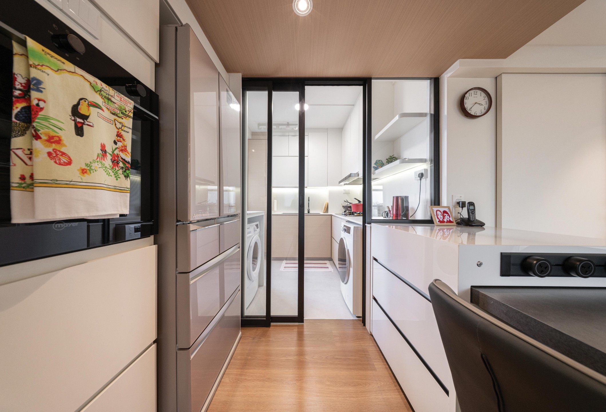 At the foyer, the ceiling was lowered to create a cosy greeting zone lined with a long sitting bench and concealed shoe storage. Homogeneous tiles make cleaning effortless, while a pocket sliding door neatly hides the household shelter.