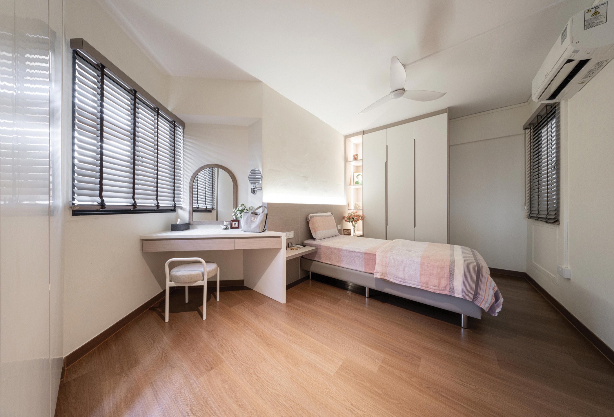 To meet the daughter’s needs, the wall between her bedroom and the master was removed, making space for a study table, an upsized wardrobe and a bedframe with drawers to accommodate her growing need for storage.