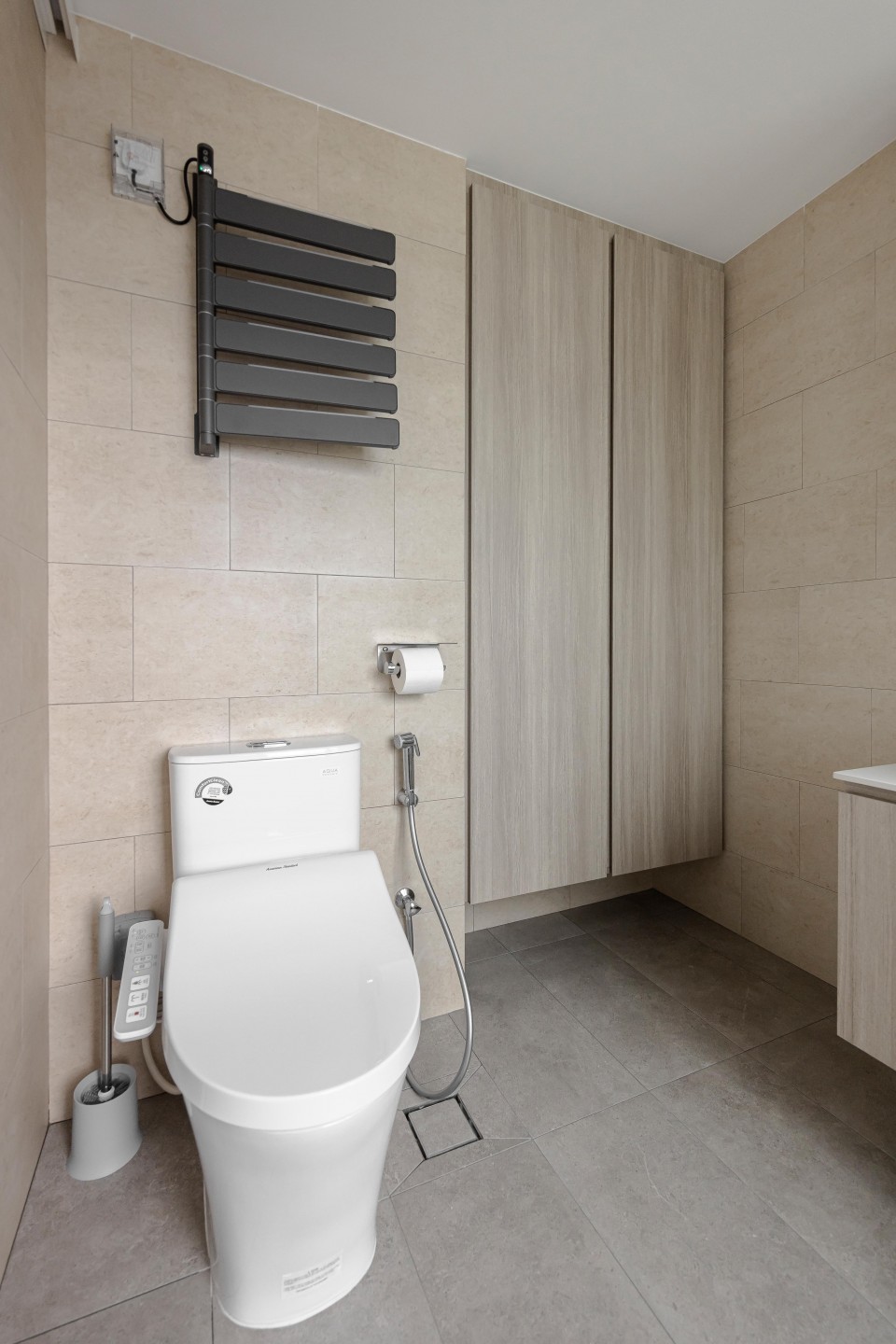 Outfitted with a bidet toilet and heated towel racks, the inspiration came during their home renovation in the peak of Singapore’s monsoon season. Frustrated by perpetually damp towels, the couple decided that heated racks would keep their towels dry and add a touch of everyday luxury.