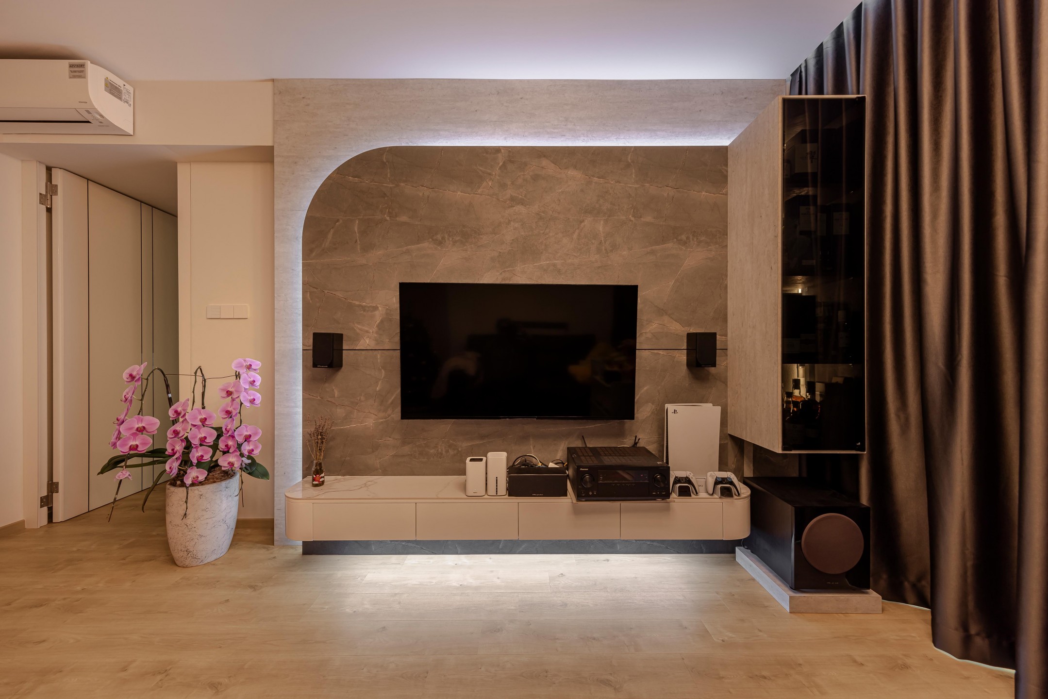 In the living room, Colin helped Kelvin—an audiophile at heart—conceal his sound system within a custom feature wall, with additional space for a liquor cabinet. Below, a subwoofer rests on a custom-built base designed to absorb vibrations.