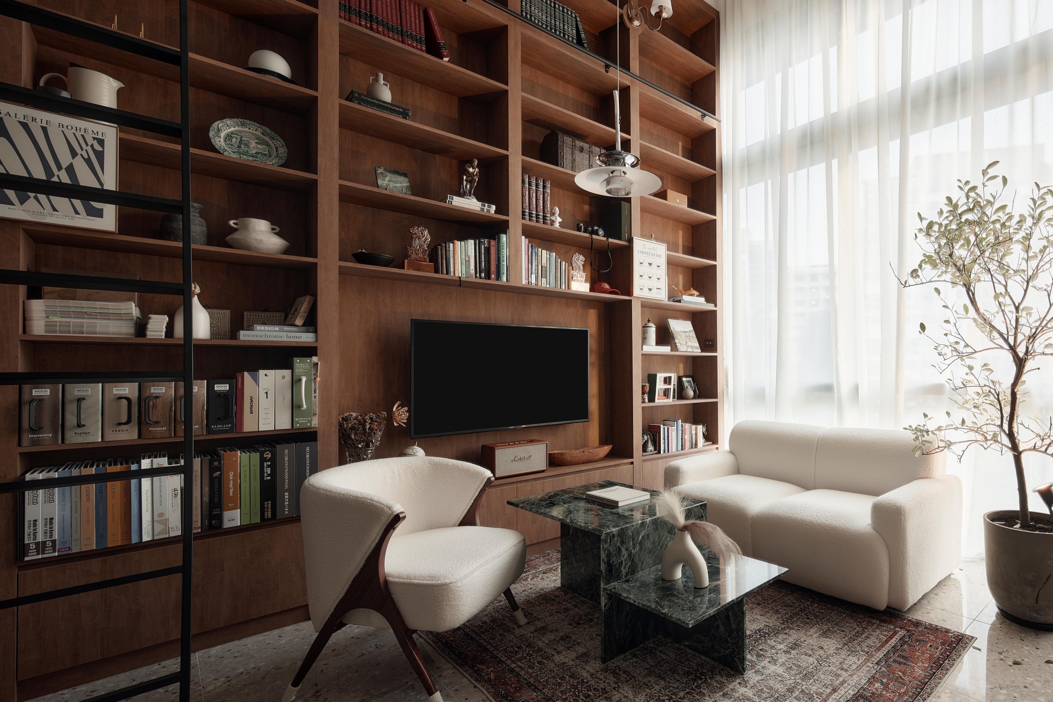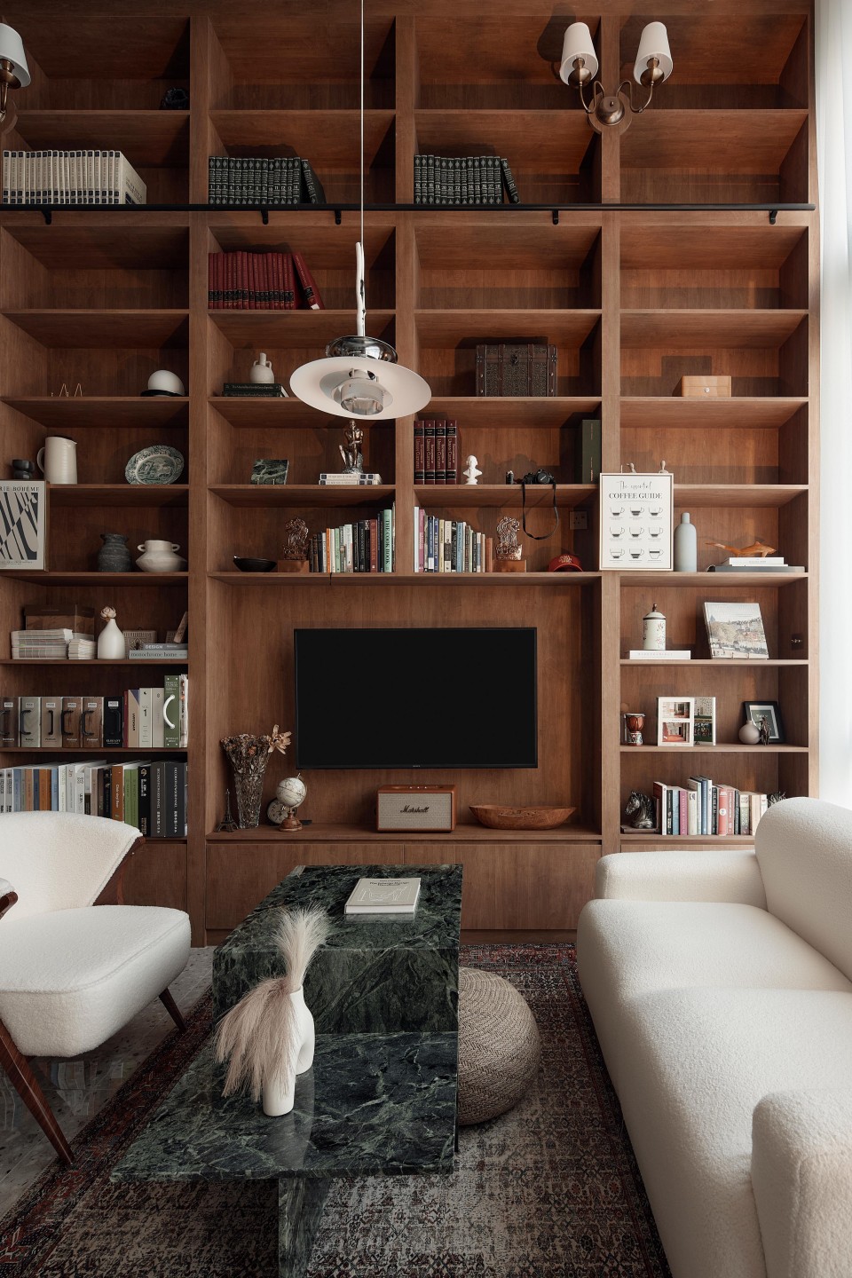 Across the room, a full-height wooden bookshelf covers the entire wall, finally putting the lofty ceiling to good use in a way the team could not in their previous office. Every compartment was designed to be the same size, except for the TV niche, which required careful measuring and re-measuring so the screen would sit at just the right height.