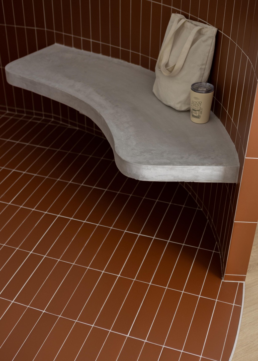 The materials immediately cue the café mood: maroon metro tiles line the entryway like a bakery counter, while glass blocks diffuse soft light and bring a hint of nostalgia. A suspended cement bench completes the foyer, turning it into a mini waiting area — only, of course, much more comfortable.