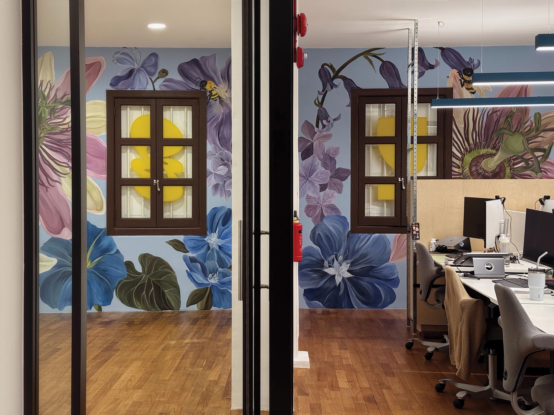 Breaking away from her signature earthy palette, Geraldine reimagines botanicals in cool tones for RIOS Architecture’s office — a refreshing take on her mural practice. Photo: Geraldine Toh